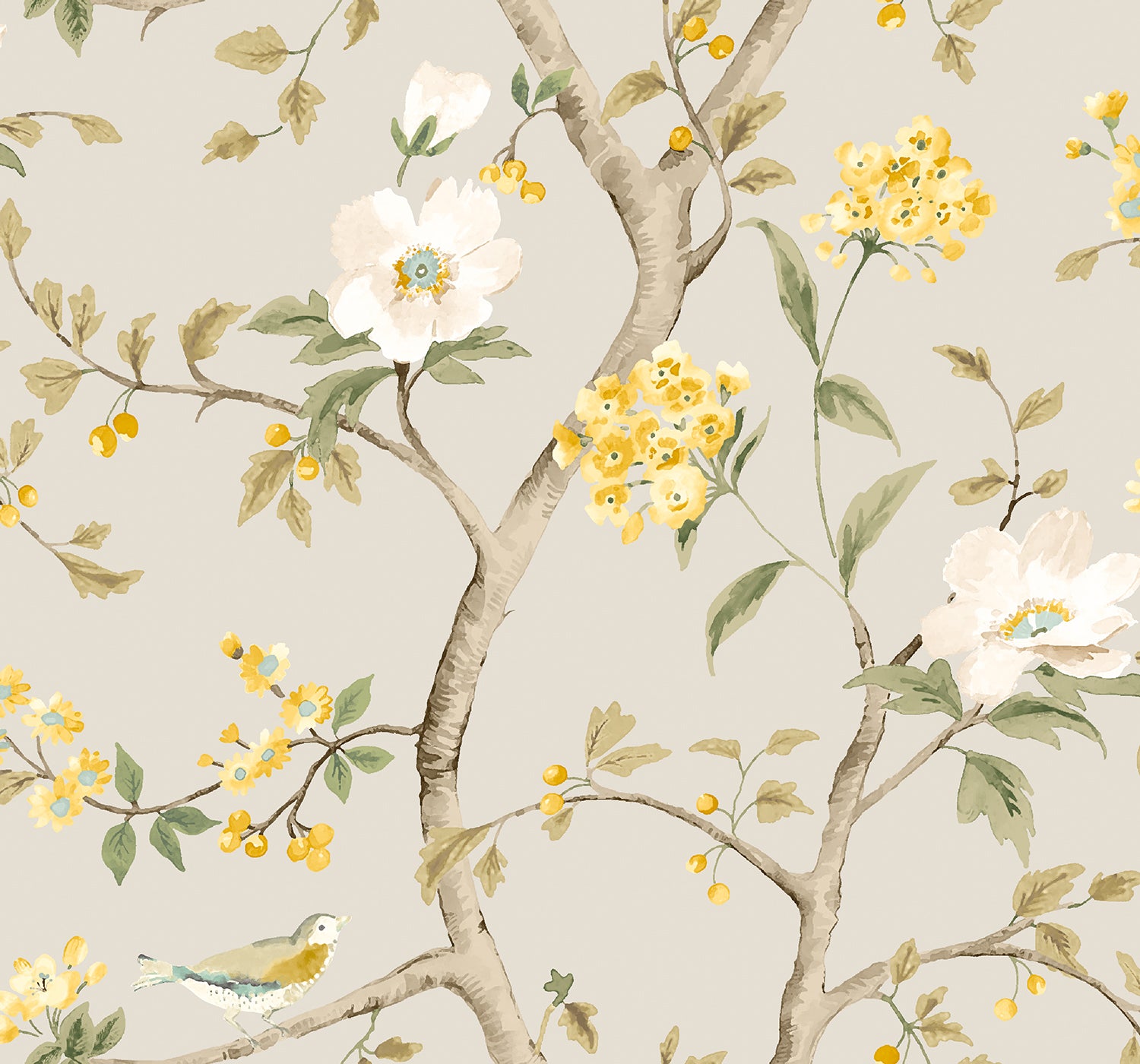 This design captures the lightness and joy of a British springtime, bringIng a fresh, contemporary take on classic nature scenes. Watercolour branches flow across the design, dotted with small blooms, berries, and playful birds that feel full of life and movement. The painterly textures and light composition create a sense of openness, evocative of spring mornings and birdsong in the air.