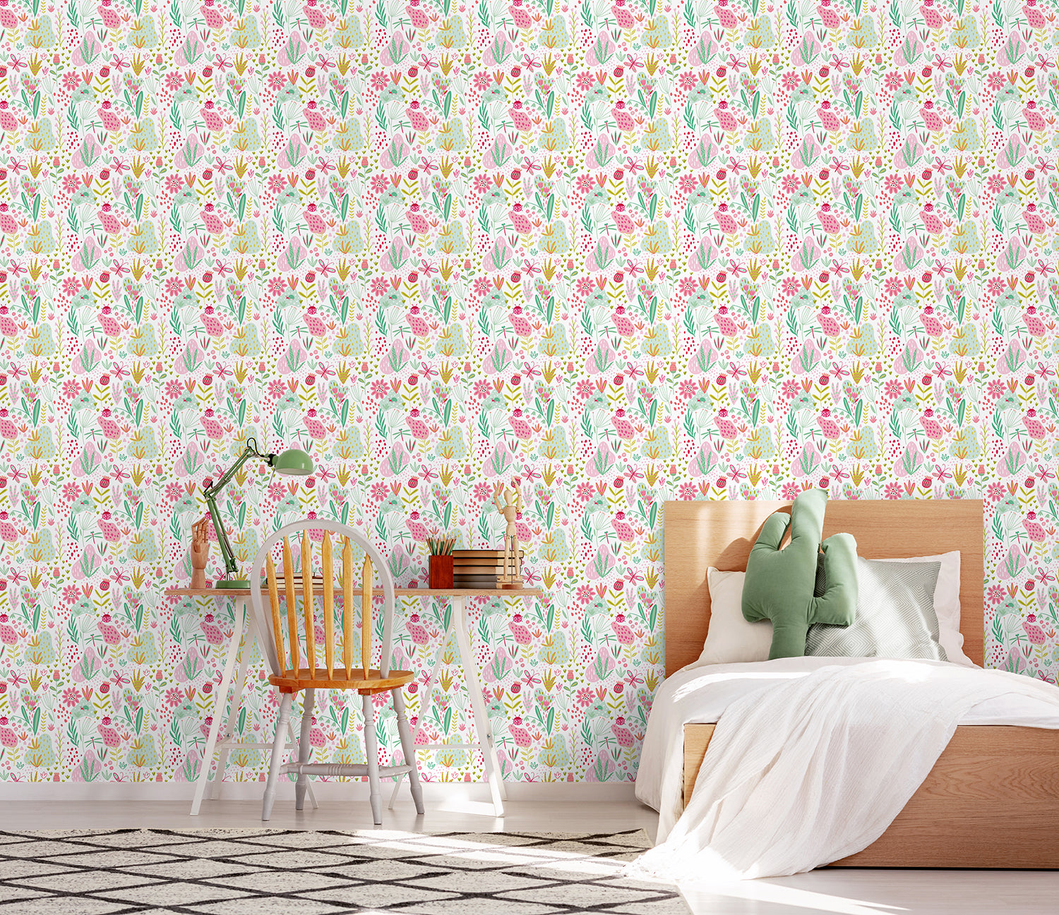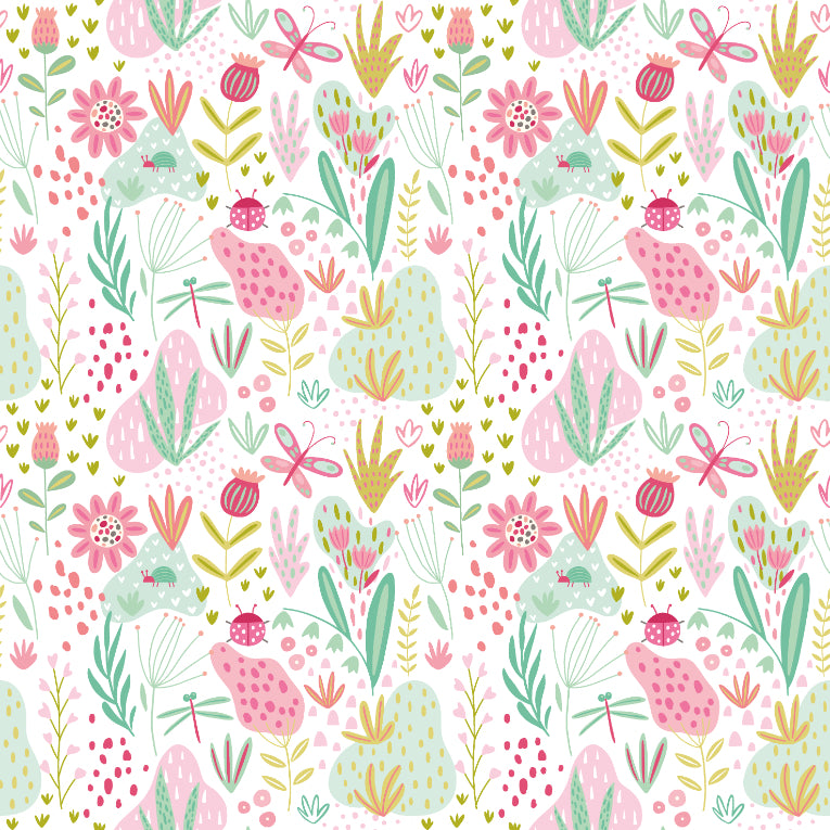 Buzzing with colour and life, beautiful butterflies and curious little ladybirds make themselves at home amongst pretty petals, budding blooms and dotty textural markings. Doodled dragon flies dance across the design, in and around the springing stems and flowers of the Ladybird Garden. Grab your magnifying glass and take a wander through this haven just made for little explorers.