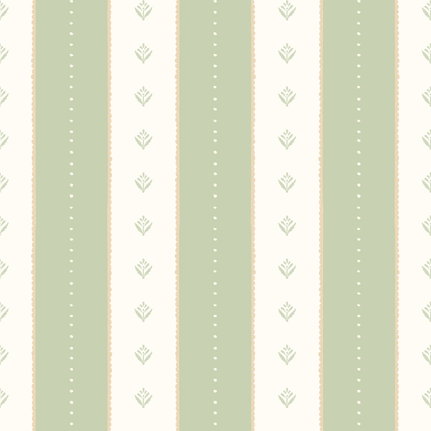 This design reimagines the traditional stripe with a crafted, contemporary edge. Broad vertical bands are softened by painterly texture, while scalloped edges introduce a subtle decorative contour. A quiet interplay of detail - fine dots and charming leaf motifs - adds rhythm and elegance.