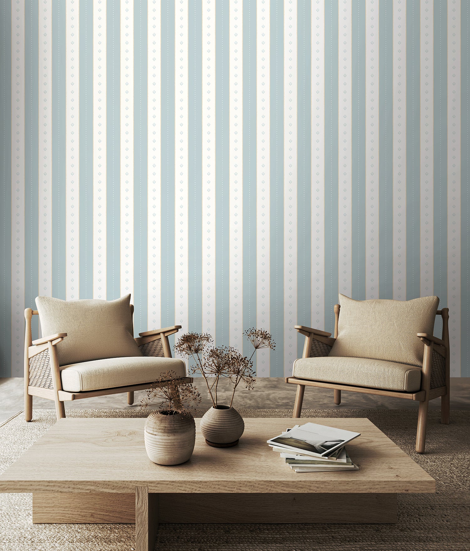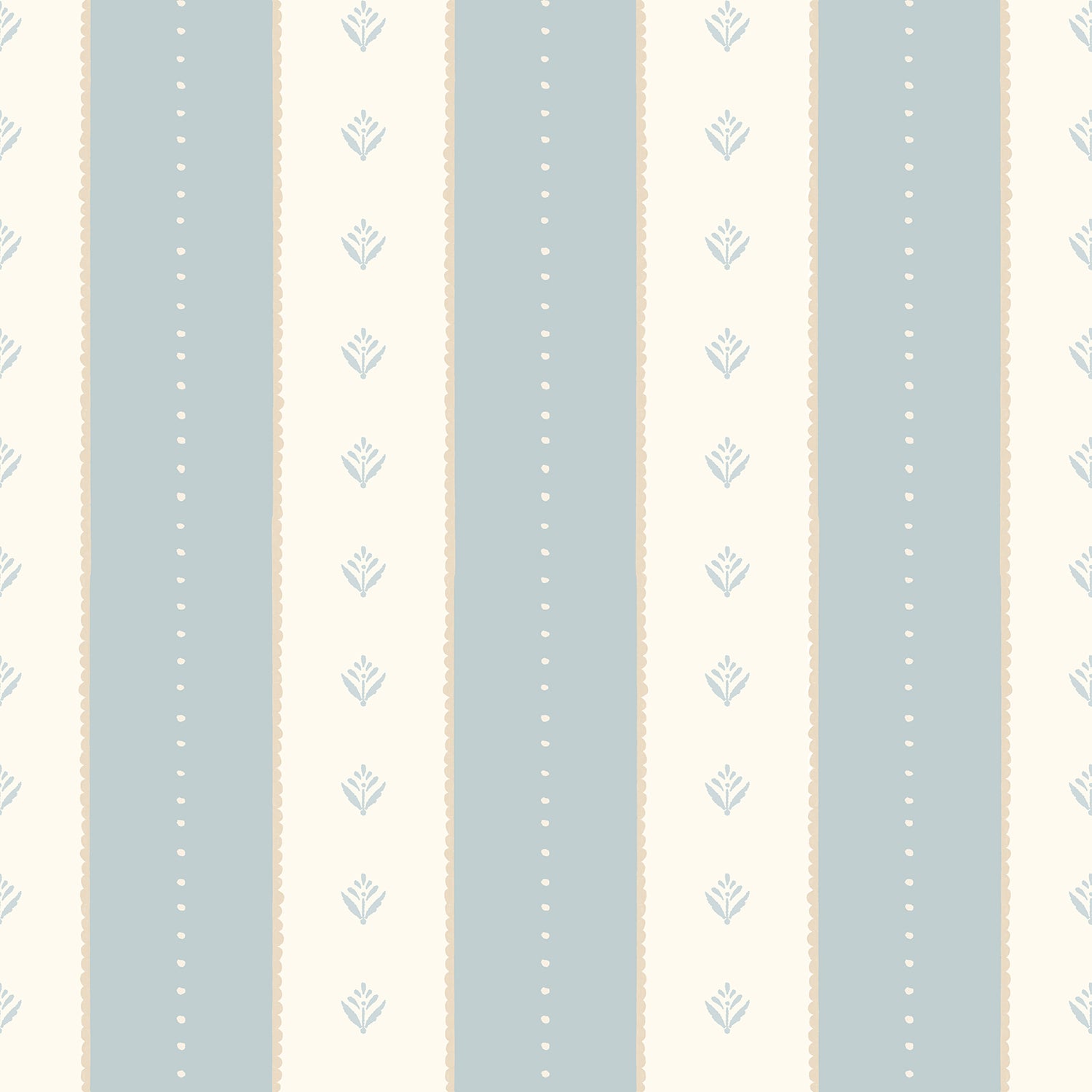 This design reimagines the traditional stripe with a crafted, contemporary edge. Broad vertical bands are softened by painterly texture, while scalloped edges introduce a subtle decorative contour. A quiet interplay of detail - fine dots and charming leaf motifs - adds rhythm and elegance.