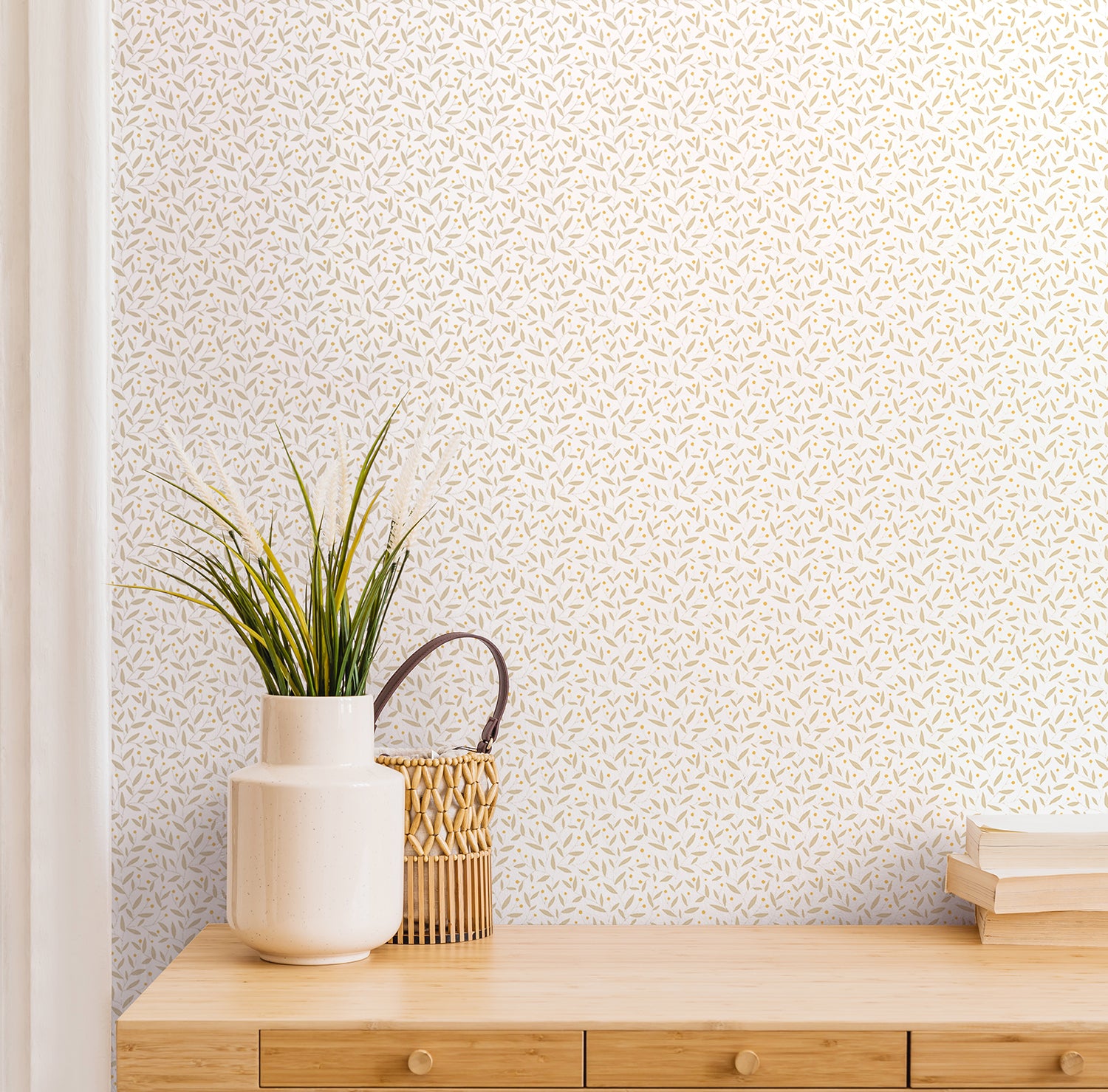 Dotty Vine is a light, flowing design that evokes a sense of movement and ease. Fine, curling vines stretch across the pattern, scattered with delicate leaves and playful berry-like dots that add subtle pops of colour. The result is airy and organic, simple yet full of gentle energy.