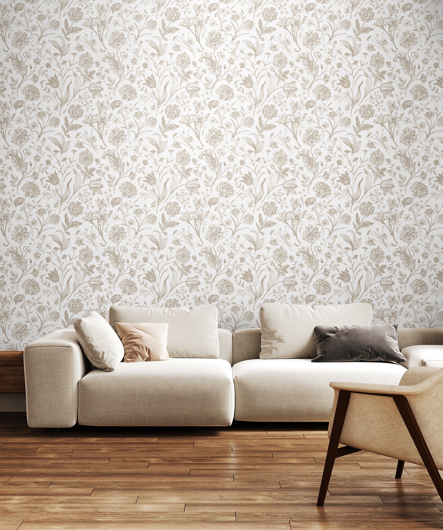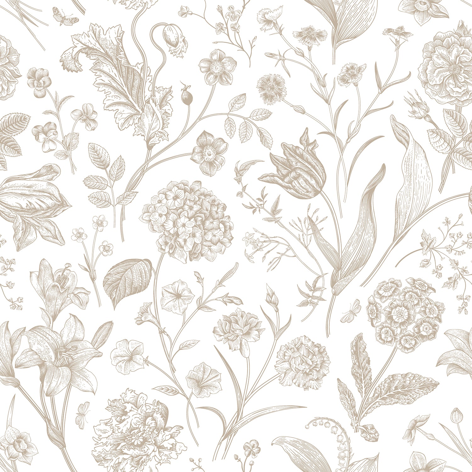Floral Toile evokes the timeless charm of classic botanical illustrations, where finely sketched blooms, leaves, and branches unfold across the design with delicate detail and texture. Reminiscent of storybook scenes - gentle, nostalgic British countryside imagery - it balances intricate artistry with an airy simplicity.